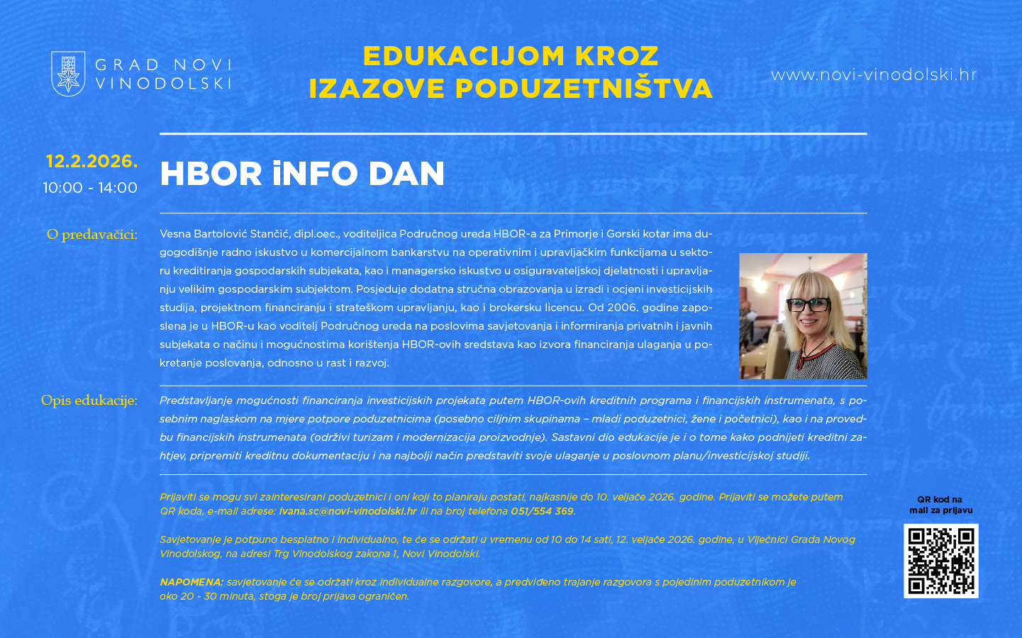 Grad Novi Vinodolski u suradnji sa HBOR Područnim uredom Rijeka, organizira individualne razgovore poduzetnika Grada Novog Vinodolskog s voditeljicom Područnog ureda, Vesnom Bartolović Stančić koji će se održati u vijećnici Grada Novog Vinodolskog (Trg Vinodolskog zakona 1/II.kat) u četvrtak 12. veljače 2026. godine u vremenu od 10,00 do 14,00 sati.